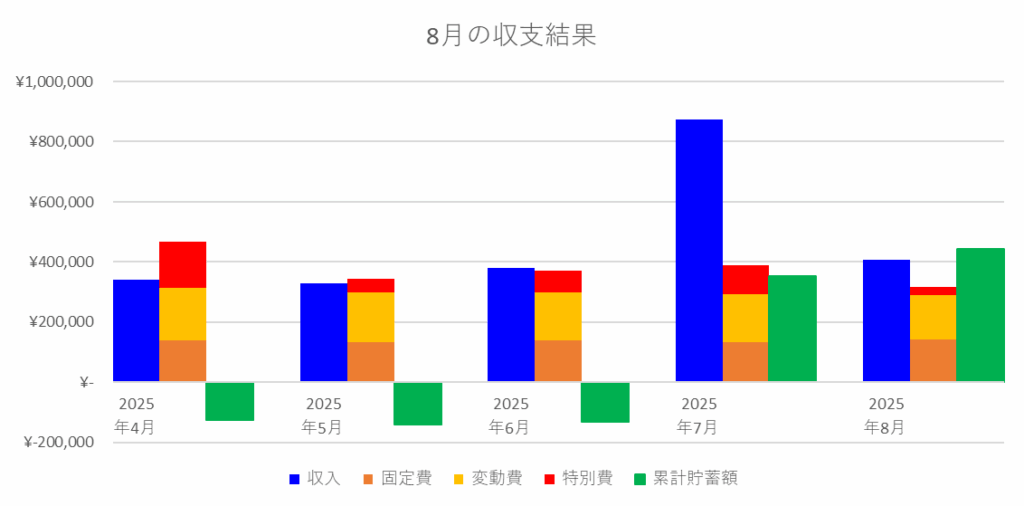8月の収支結果と累計貯蓄額をグラフにすると以下の通りです。累計貯蓄額がプラスに伸びました。引き続き貯蓄額を伸ばしていきたいと思います。