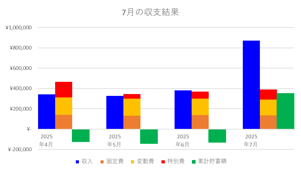 7月の収支結果と累計貯蓄額をグラフにすると以下の通りです。給与だけでも黒字化できたことと賞与のおかげで一気に挽回できました。