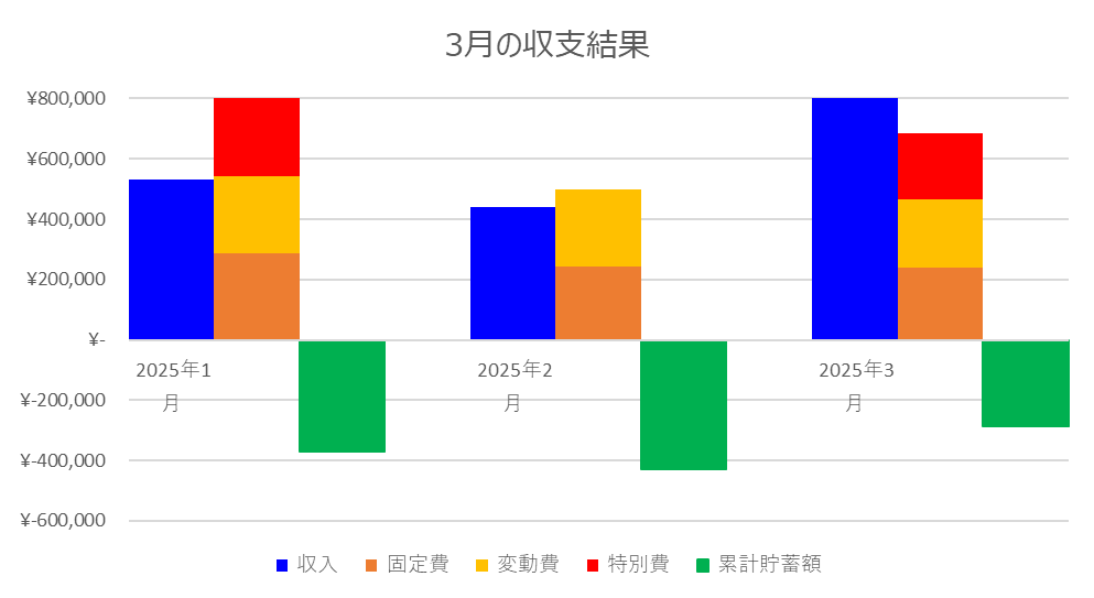 3月の収支結果と累計貯蓄額をまとめると以下の通りです。